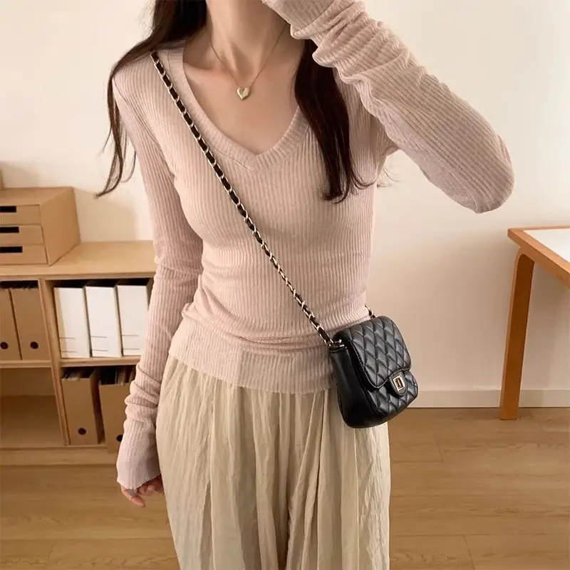Женская трикотажная футболка с V-образным вырезом и длинным рукавом