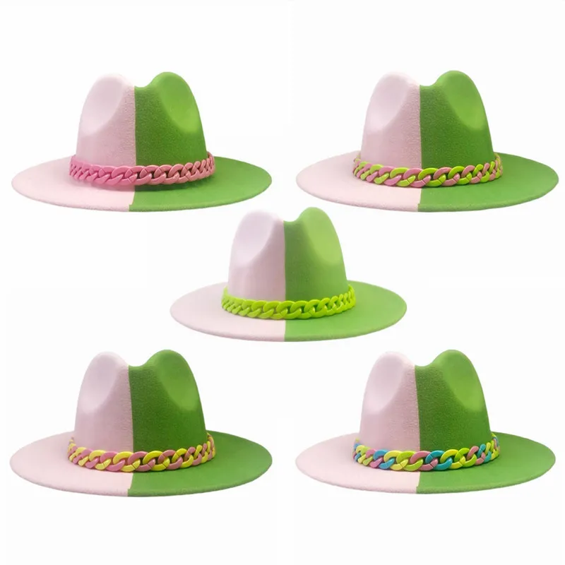 Женская фетровая шляпа с широкими полями, летняя шляпа зеленого и розового цвета с яркой цепочкой