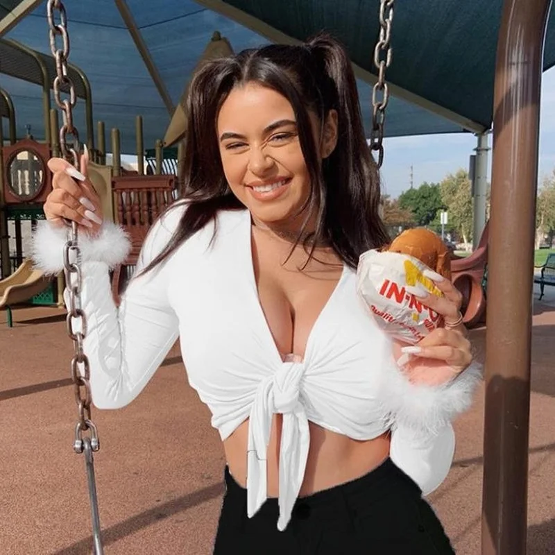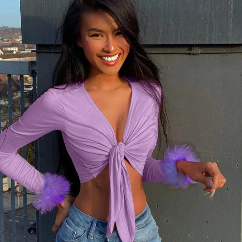 Женская футболка из искусственного меха, с V-образным вырезом и длинным рукавом