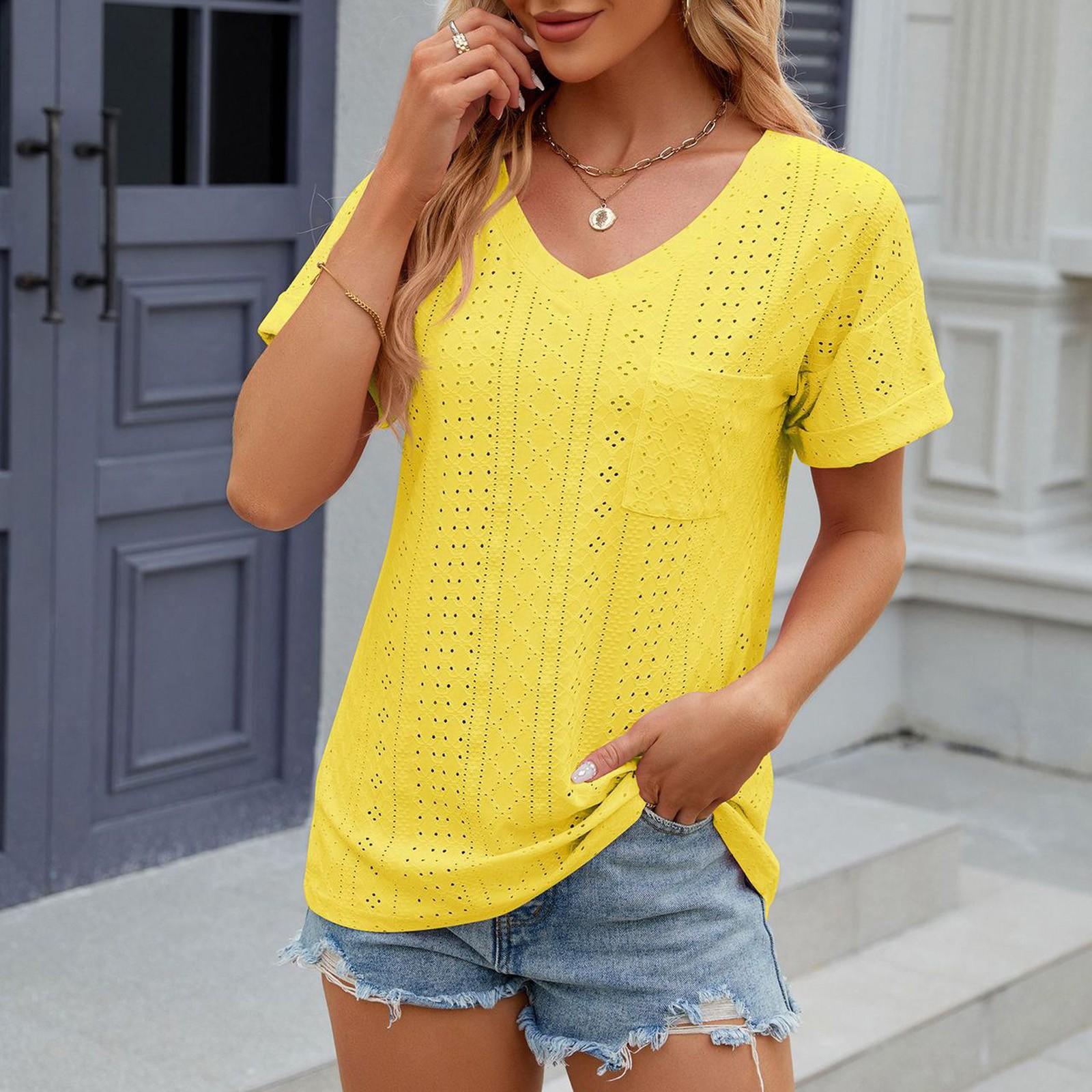 Женская футболка, однотонные блузки с короткими рукавами, плиссированные мягкие туники с V-образным вырезом и карманом L жёлтый