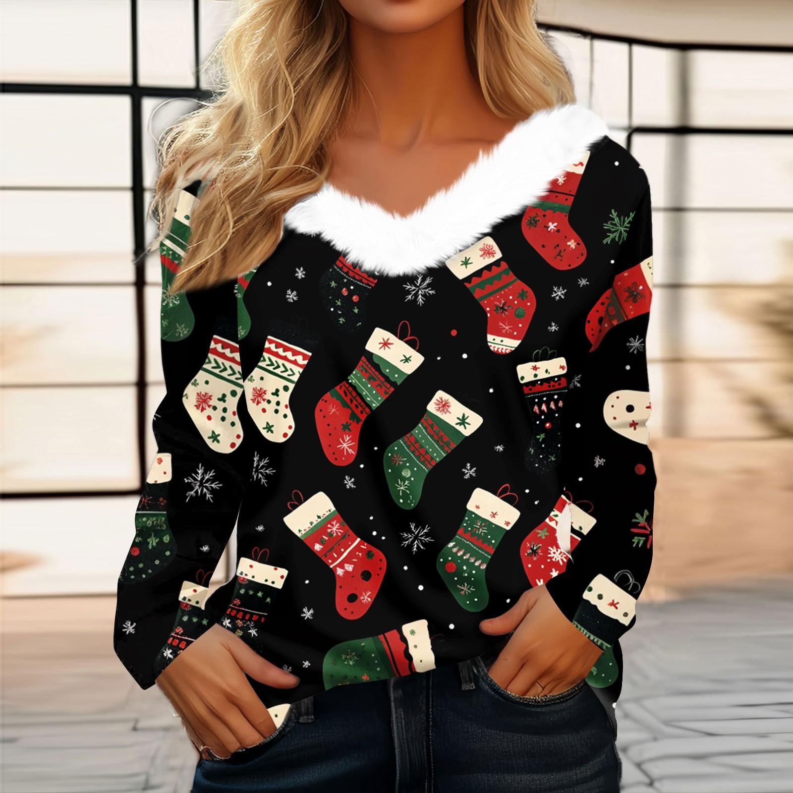 Женская футболка, рождественская рубашка с длинным рукавом, вечерние, рождественский флисовый воротник, топ с v-образным вырезом M