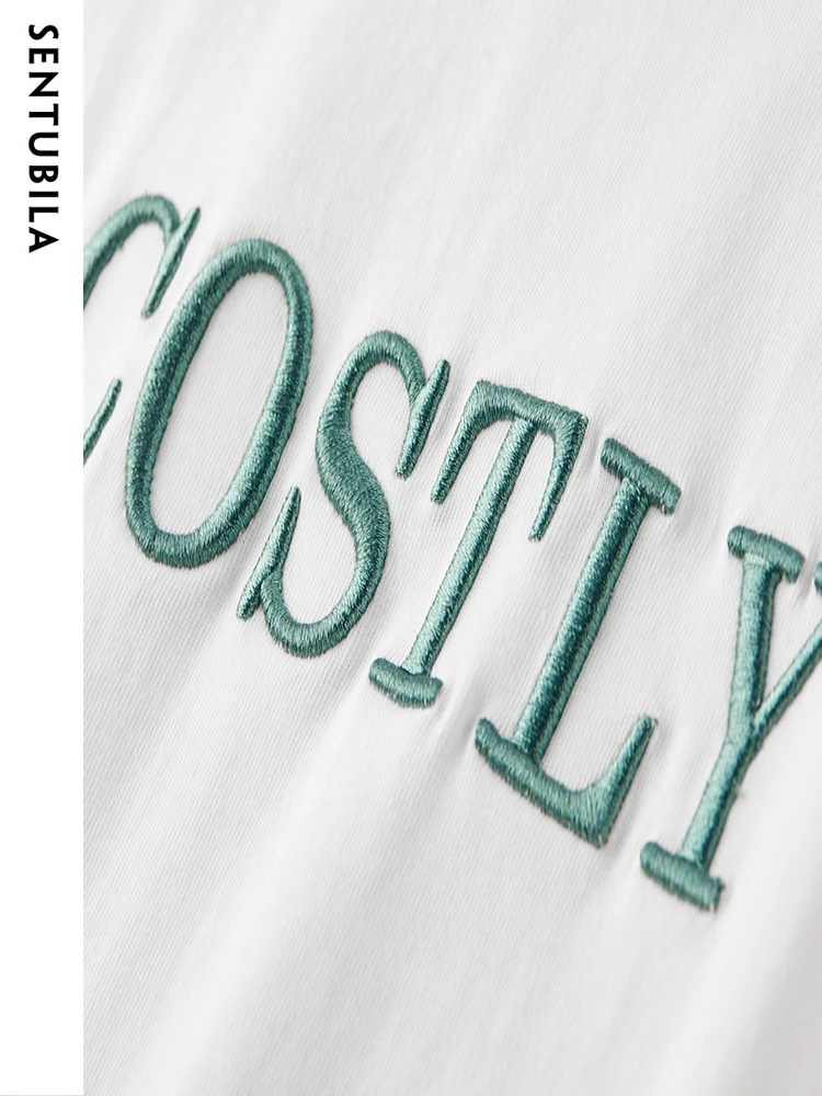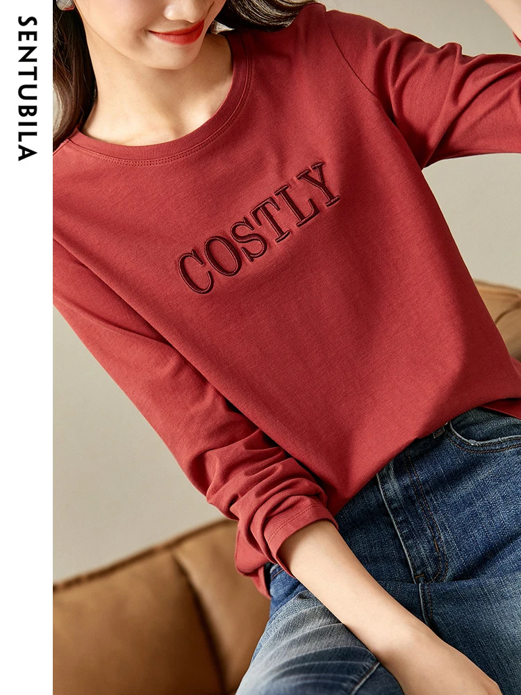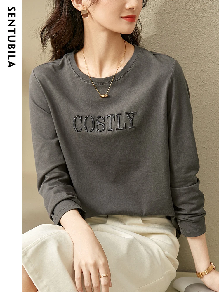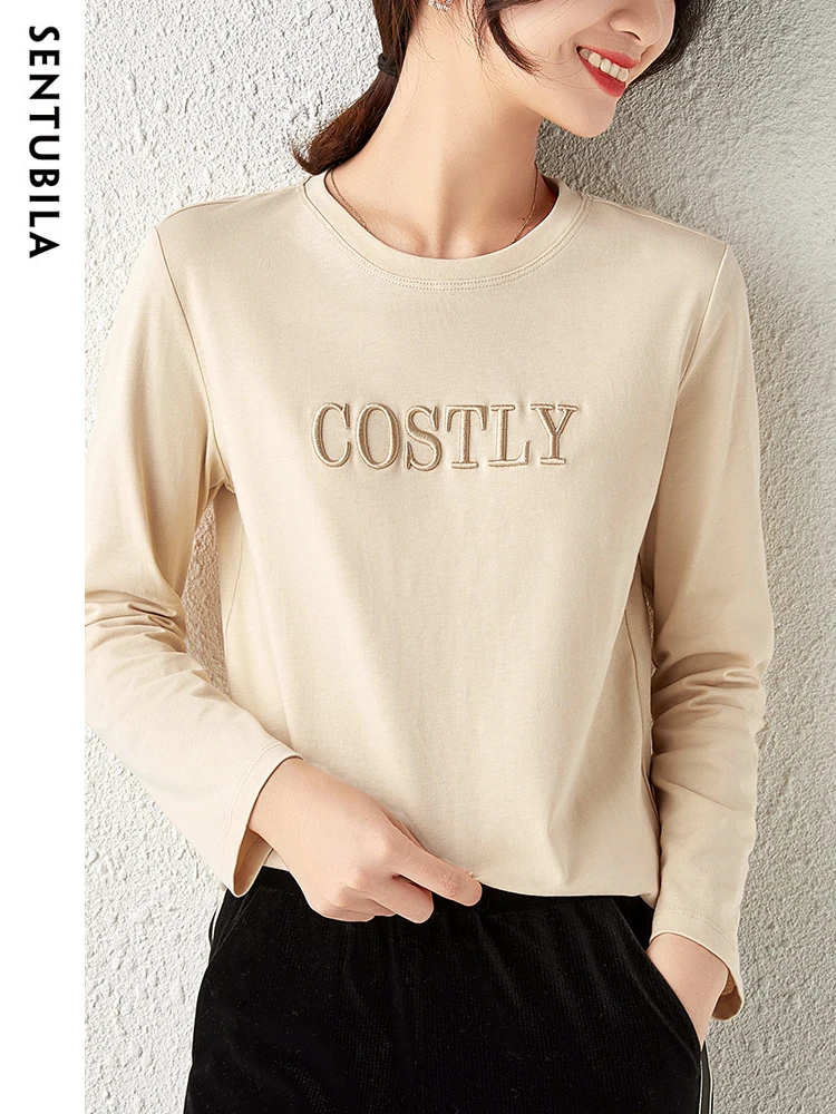 Женская футболка с вышивкой, круглым вырезом и длинным рукавом