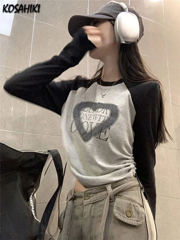 Женская футболка с длинным рукавом, облегающий Топ контрастных цветов с принтом сердца, плиссированная бандажная футболка в Корейском стиле, Y2k, весна