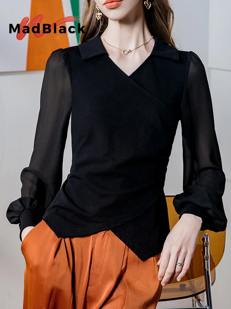 Женская футболка с длинным рукавом-фонариком, с отложным воротником