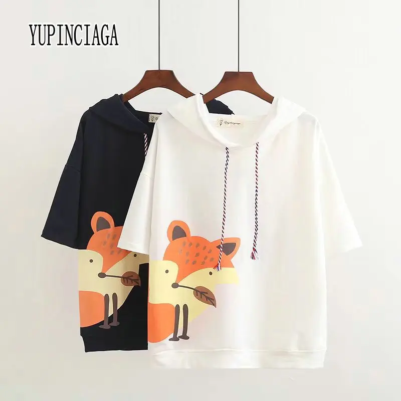 Женская футболка с капюшоном YUPINCIAGA, Повседневная Свободная футболка с капюшоном с принтом лисы в японском стиле мори, топ с коротким рукаво...