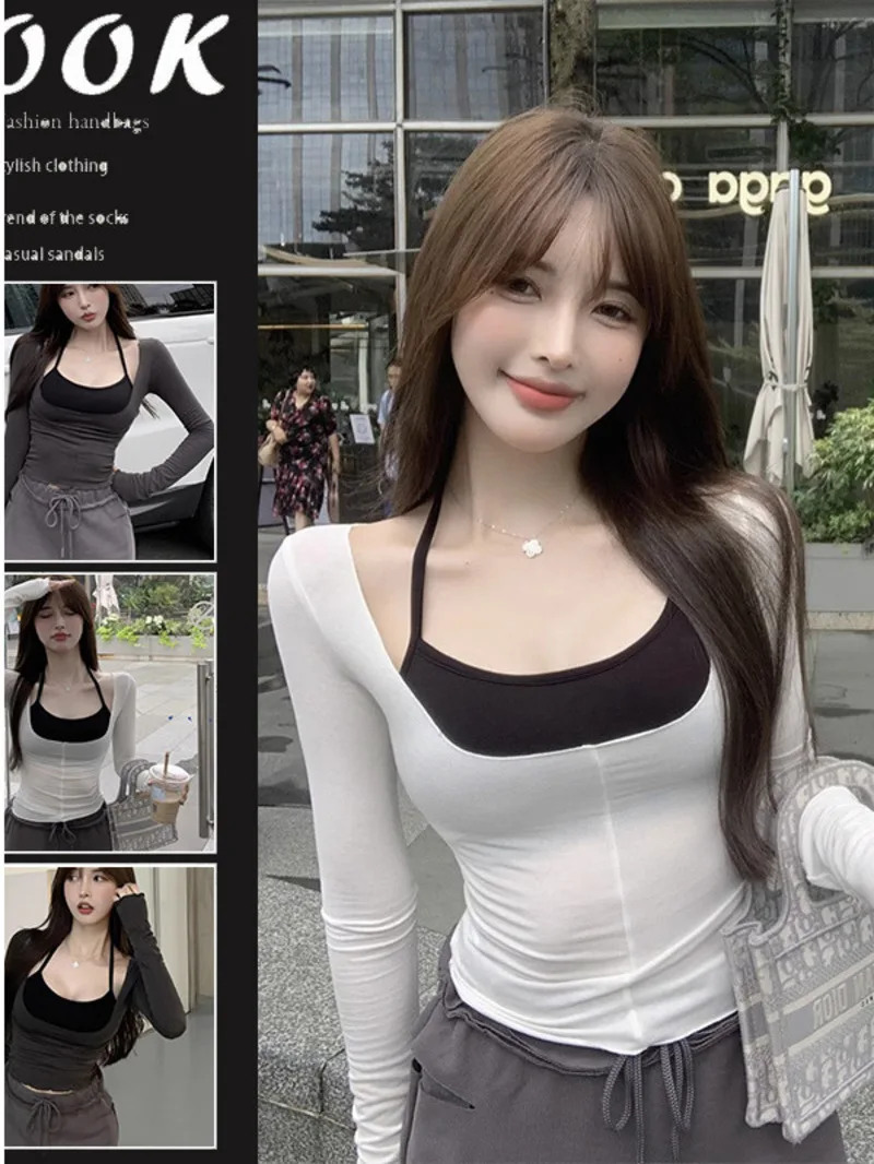 Женская футболка с квадратным вырезом, белая облегающая футболка с длинным рукавом, в минималистичном стиле, на осень, P5NU