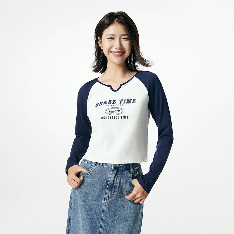 Женская футболка с контрастными рукавами реглан, круглым вырезом и надписью