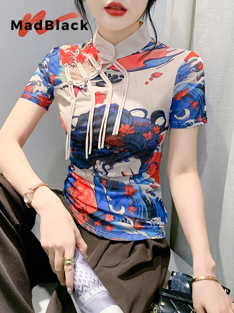 Женская футболка с коротким рукавом и воротником-мандарином, в китайском стиле