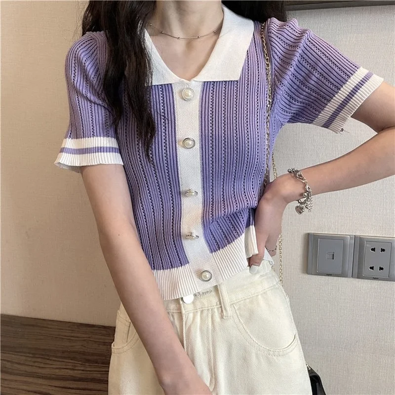 Женская футболка с коротким рукавом, с высокой талией и отложным воротником