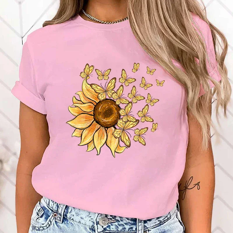 Женская футболка с коротким рукавом, круглым вырезом и принтом подсолнухов и бабочек