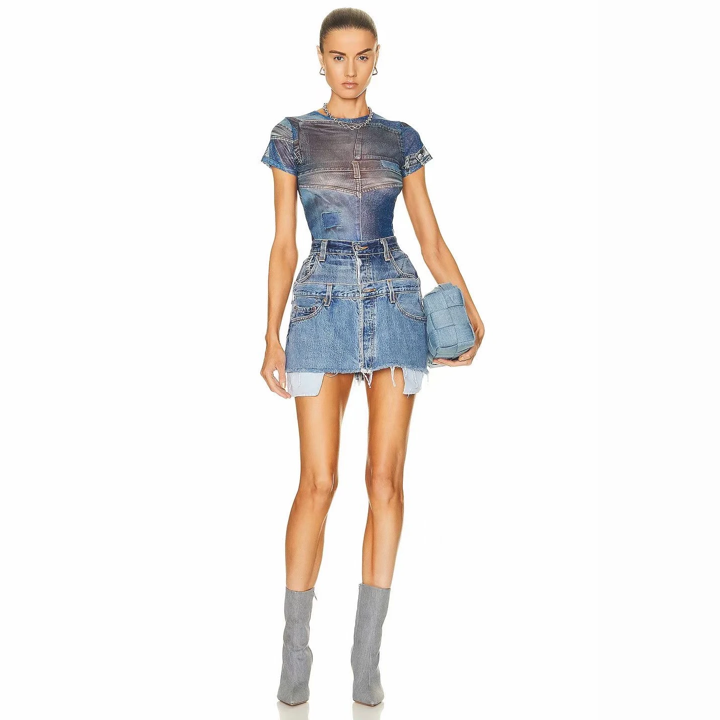 Женская футболка с коротким рукавом, синяя облегающая футболка с имитацией джинсовой ткани, с круглым вырезом и принтом, нишевой дизайн, стрейчевый сетчатый топ, новинка 2023