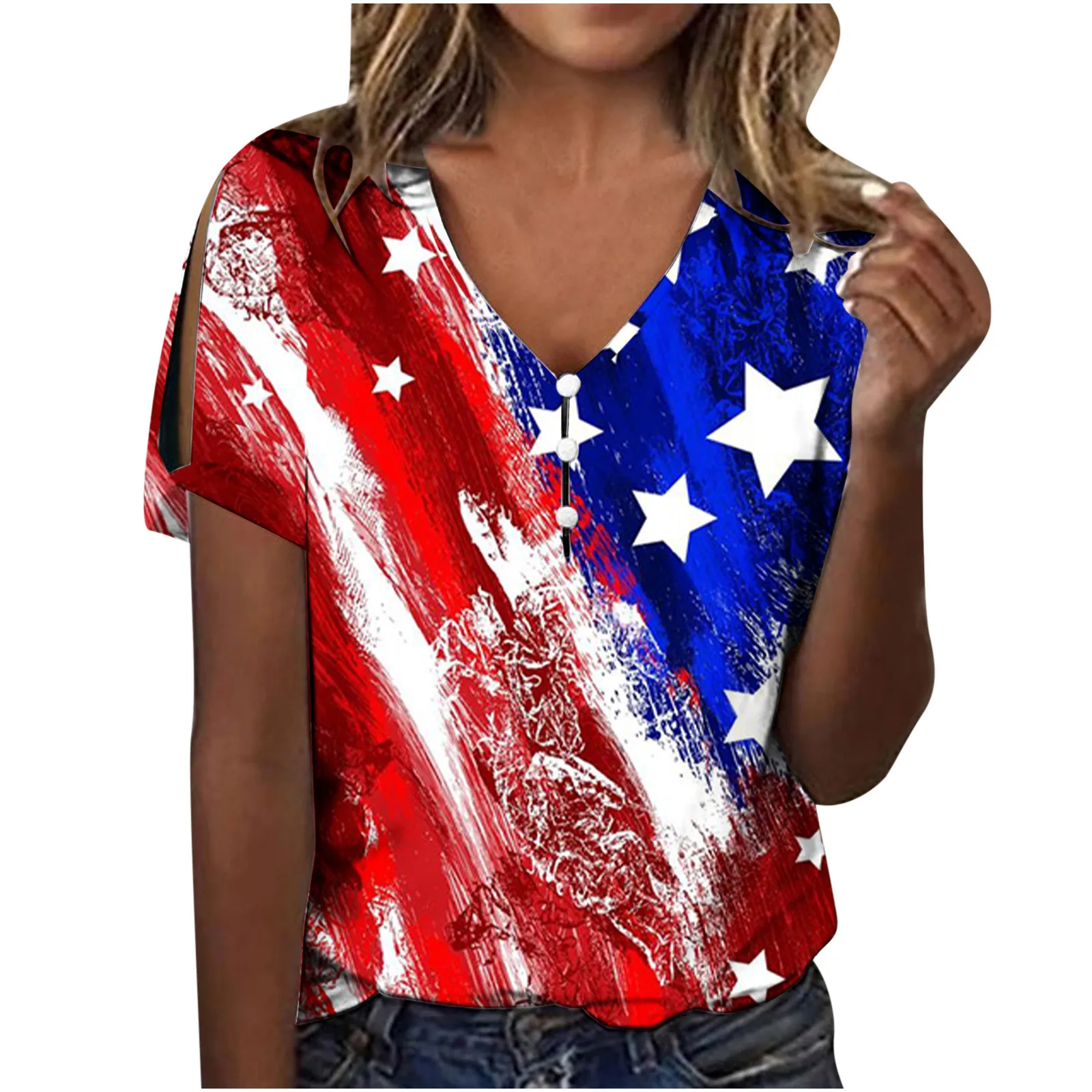 Женская футболка с коротким рукавом, V-образным вырезом и принтом на пуговицах