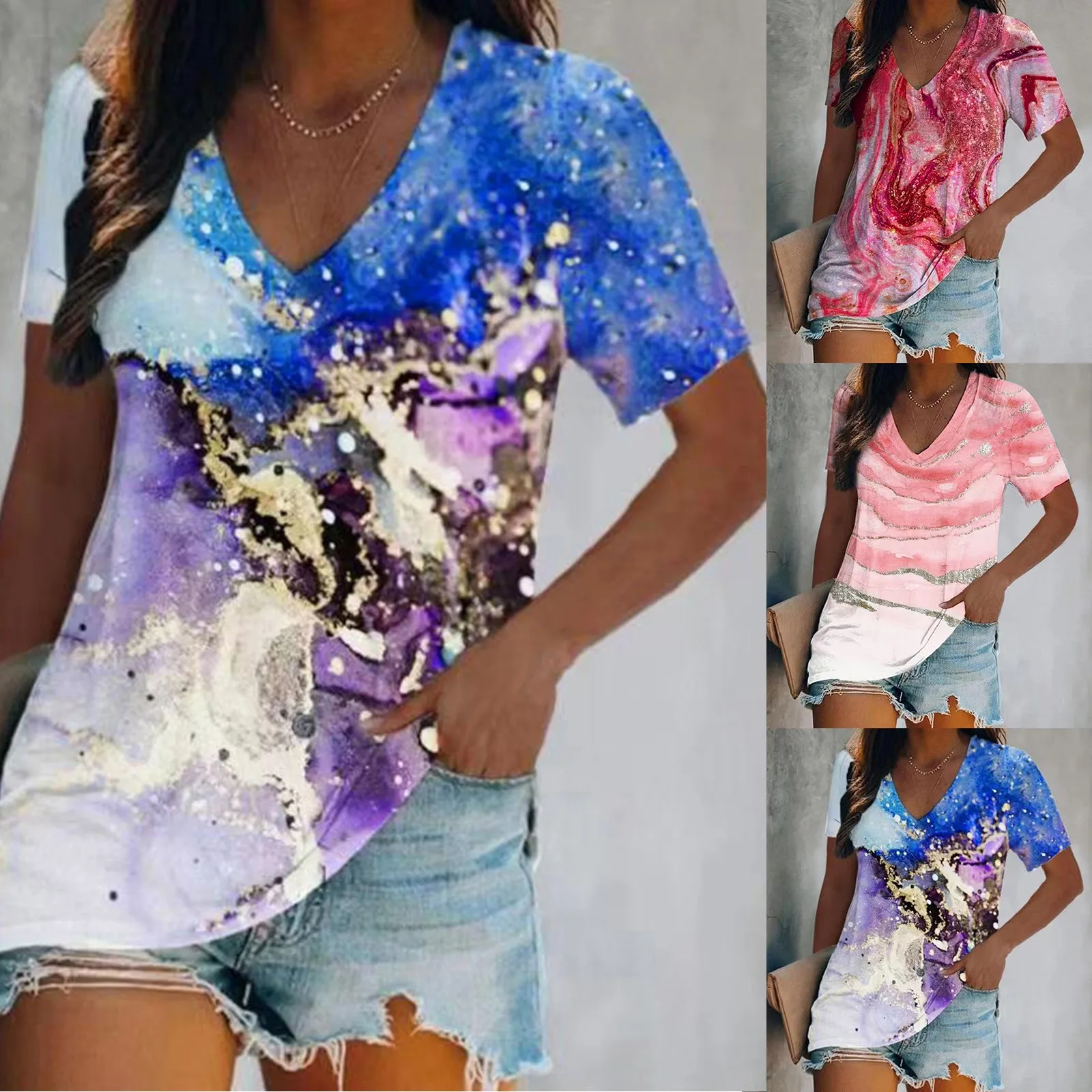 Женская футболка с коротким рукавом и V-образным вырезом, с принтом