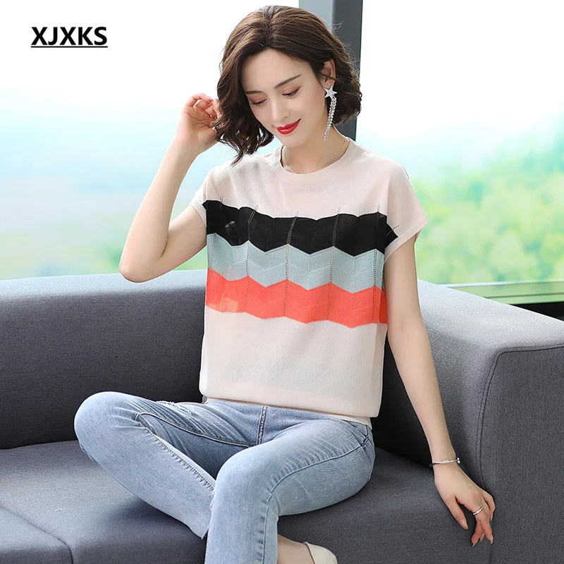Женская футболка с коротким рукавом XJXKS, трикотажная футболка свободного покроя, лето 2021, размера плюс