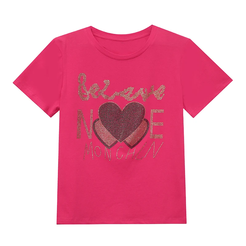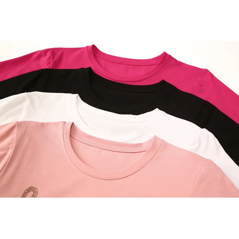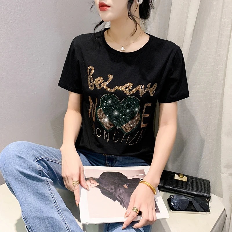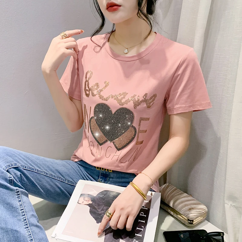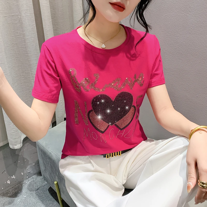 Женская футболка с круглым вырезом, коротким рукавом и блестящими стразами