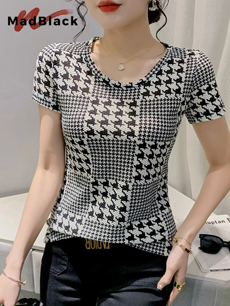 Женская футболка с круглым вырезом, коротким рукавом и принтом «гусиная лапка»