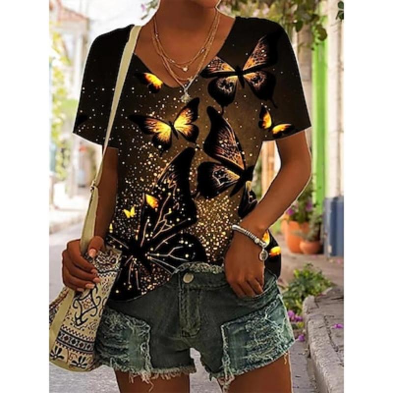 Женская футболка с простым неоновым и ярким абстрактным принтом, короткий рукав, стандартные топы с V-образным вырезом, повседневные, выходные, желто-синие, золотисто-голубые XL