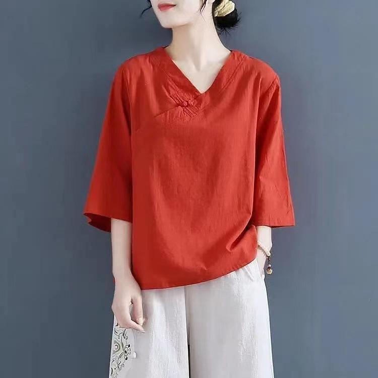 Женская футболка с рукавом пять точек большого размера из хлопка и льна на осень и лето, новая свободная приталенная с V-образным вырезом, базовая футболка для чая 4XL оранжевый