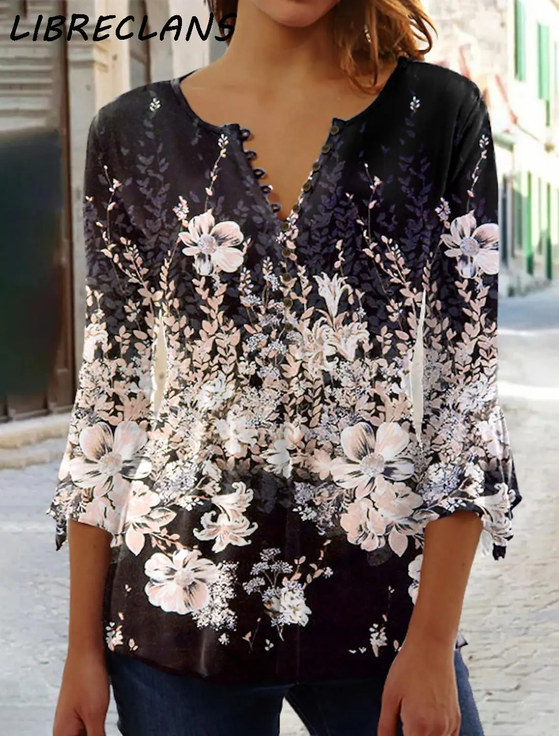 Женская футболка с цветочным принтом, Повседневная футболка с длинным рукавом и V-образным вырезом, с цветочным принтом, лето-осень 3/4