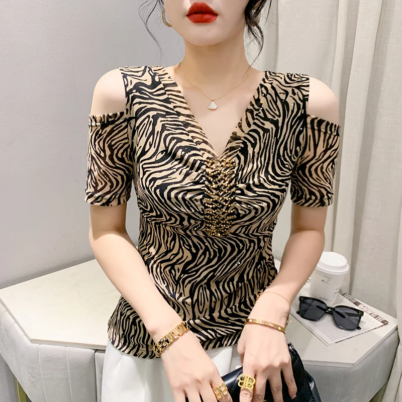 Женская футболка с V-образным вырезом, коротким рукавом и открытыми плечами