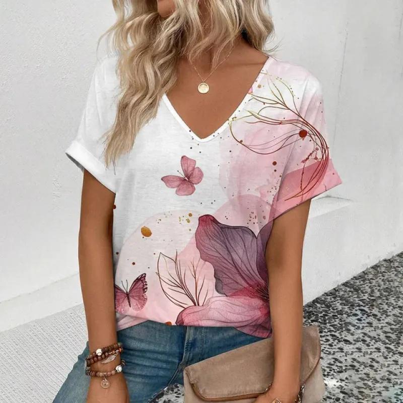 Женская футболка с v-образным вырезом, модная футболка с цветочным принтом в стиле ретро, футболка с короткими рукавами для отдыха, летняя популярная футболка 2024 г. 6XL