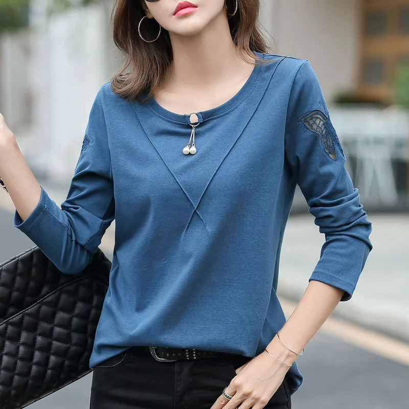Женская хлопковая Футболка с вышивкой, ажурная футболка с длинным рукавом и воротником-бантом, украшенная бусинами