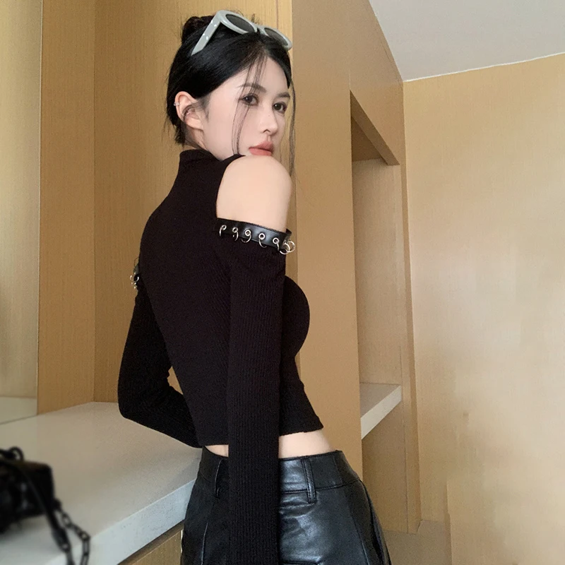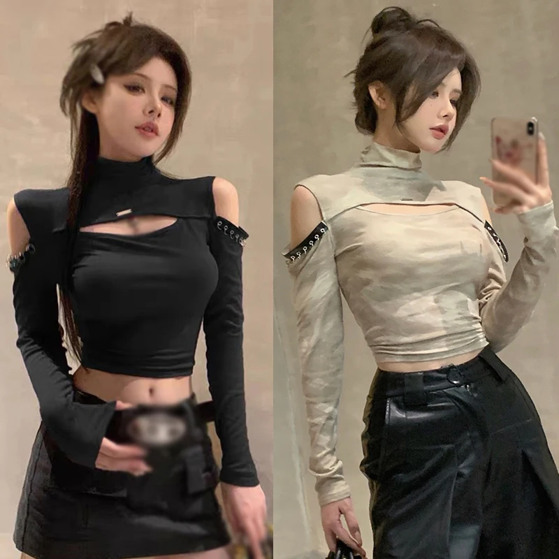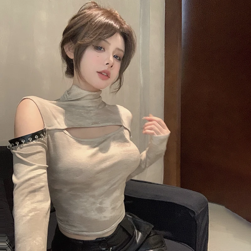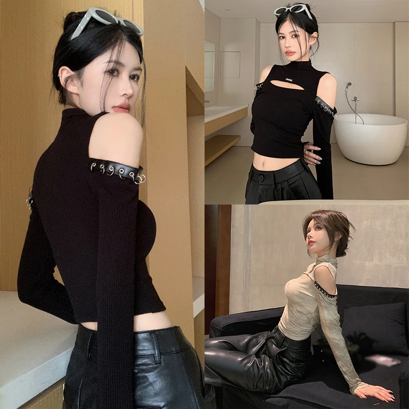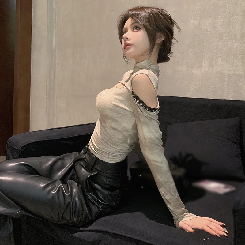 Женская хлопковая приталенная рубашка с длинным рукавом, открытыми плечами и воротником-лодочкой