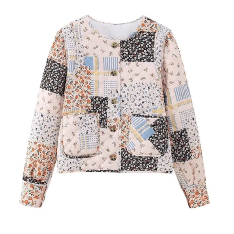 Женская хлопковая стеганая куртка с большими карманами и цветочным принтом