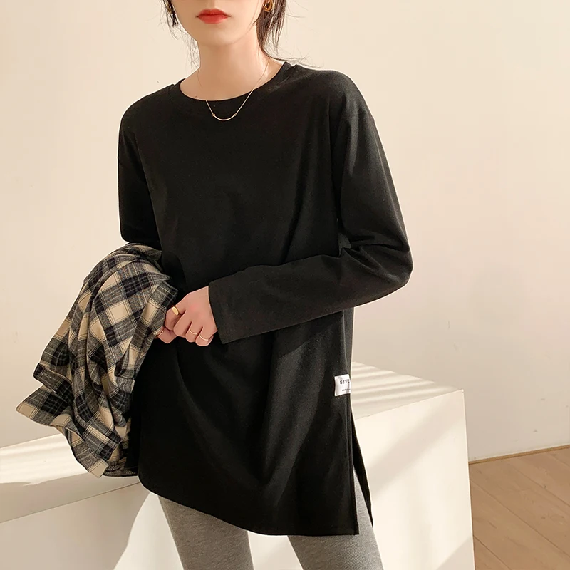 Женская хлопковая футболка с длинным рукавом, черная футболка большого размера с круглым вырезом и Боковым Разрезом, весна-осень 100%