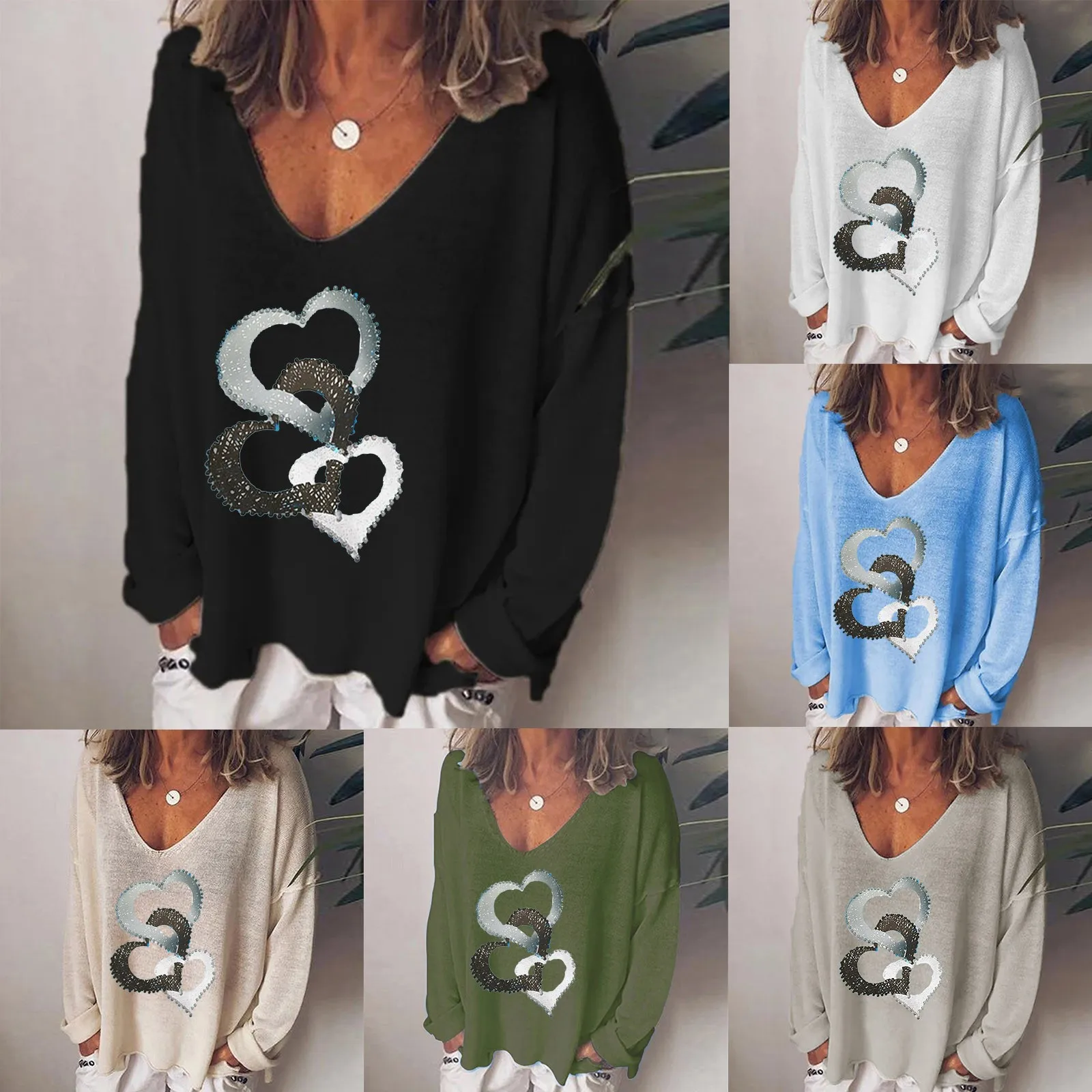 Женская хлопковая футболка с длинным рукавом, V-образным вырезом и принтом