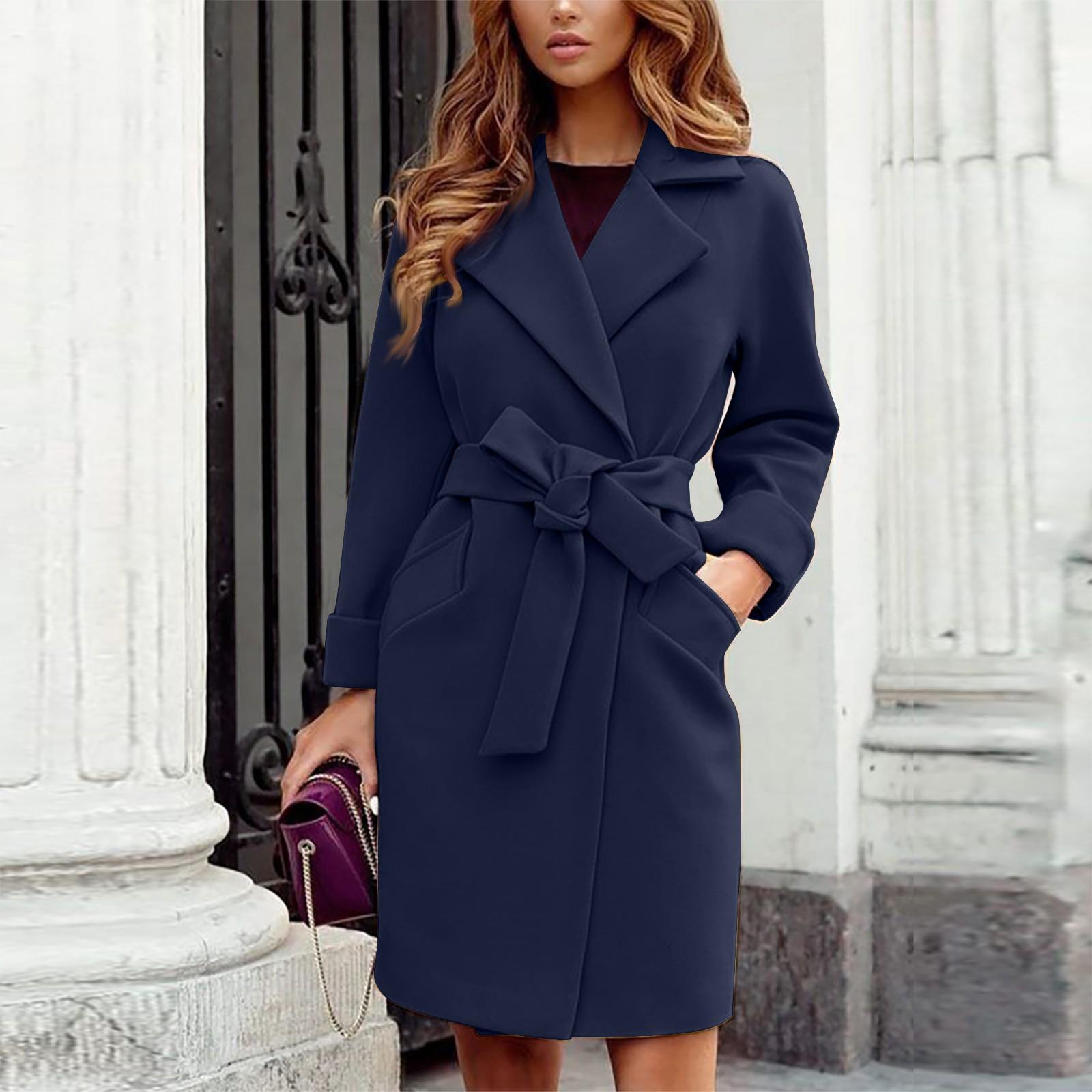 Женская шерстяная модная облегающая куртка с поясом и лацканами, шерстяная куртка с карманами, фланелевая куртка, пальто XXL тёмно-синий