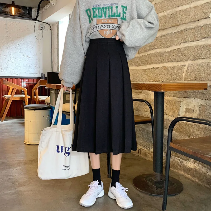 Женская шерстяная плиссированная юбка, черная Повседневная трапециевидная длинная юбка с высокой талией в Корейском стиле ретро, Осень-зима 2024