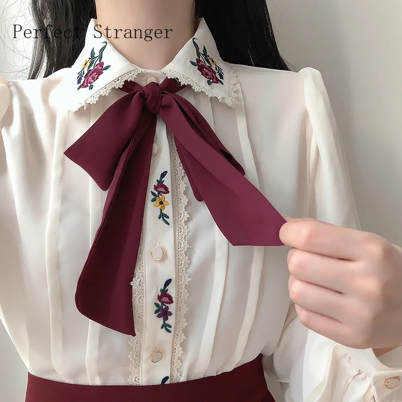 Женская шикарная винтажная блуза с отложным воротником и цветочной вышивкой