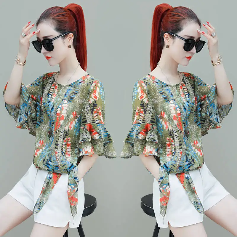 Женская шифоновая блузка с коротким рукавом и круглым вырезом