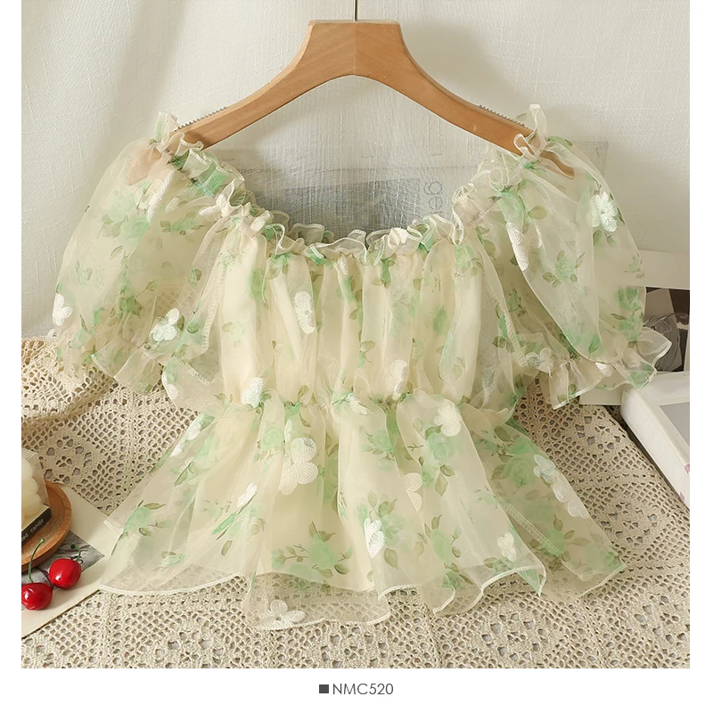 Женская шифоновая блузка с цветочным принтом и открытыми плечами