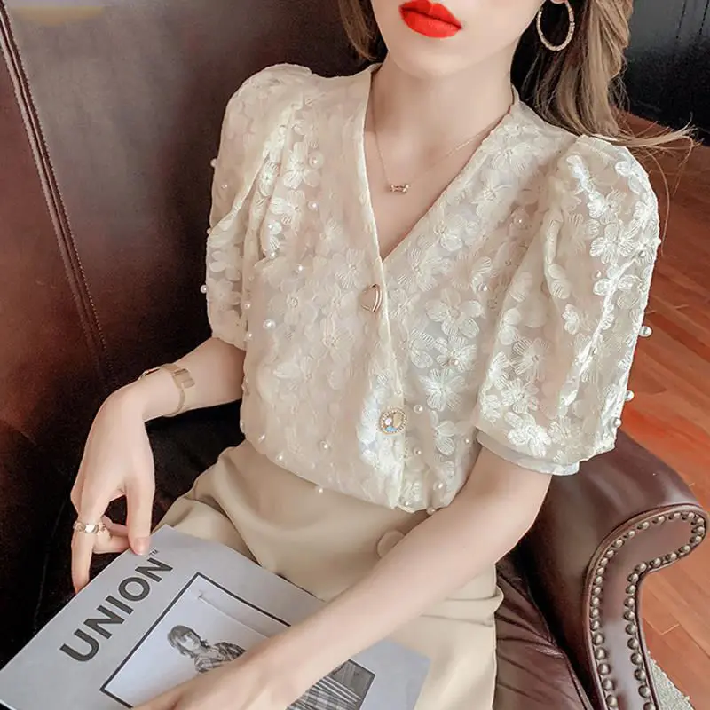 Женская шифоновая блузка с V-образным вырезом, кружевная Свободная рубашка с коротким рукавом, однотонная блузка, модель F89 на лето, 2022
