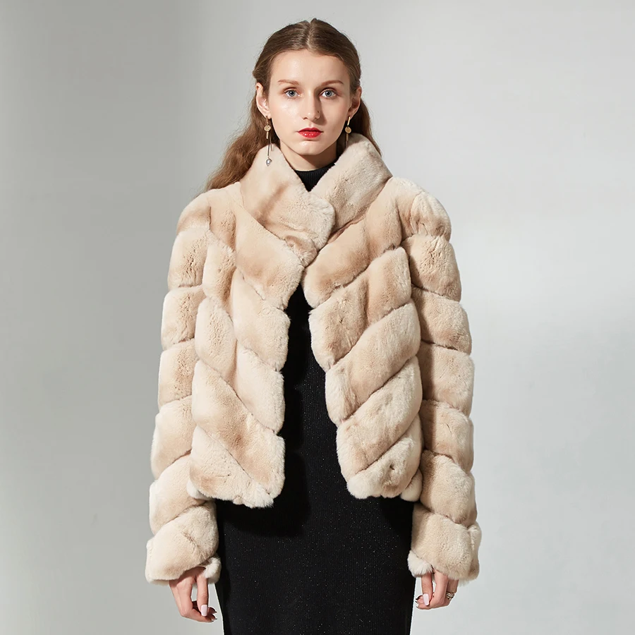 Женская шуба из меха кролика Рекс, бежевая зимняя куртка с воротником-стойкой