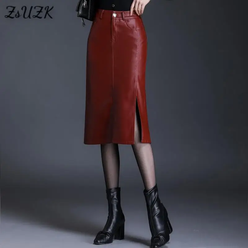 Женская юбка-карандаш из ПУ кожи, с Боковым Разрезом и высокой талией