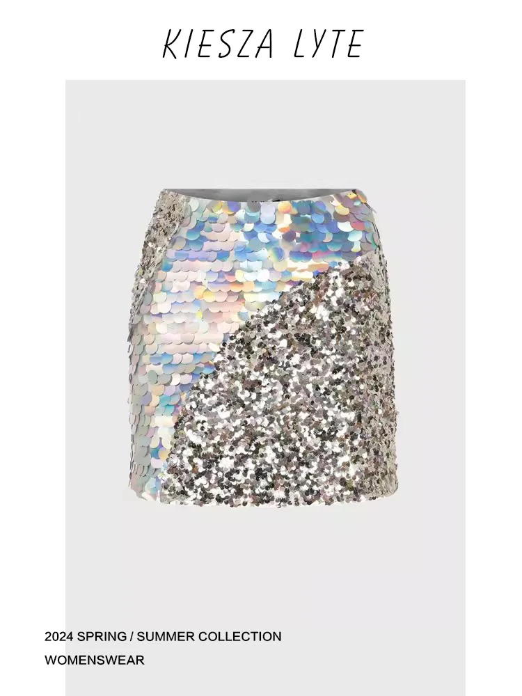 Женская юбка с блестками, разноцветная короткая юбка составного кроя с серебряными блестками, лето 2024