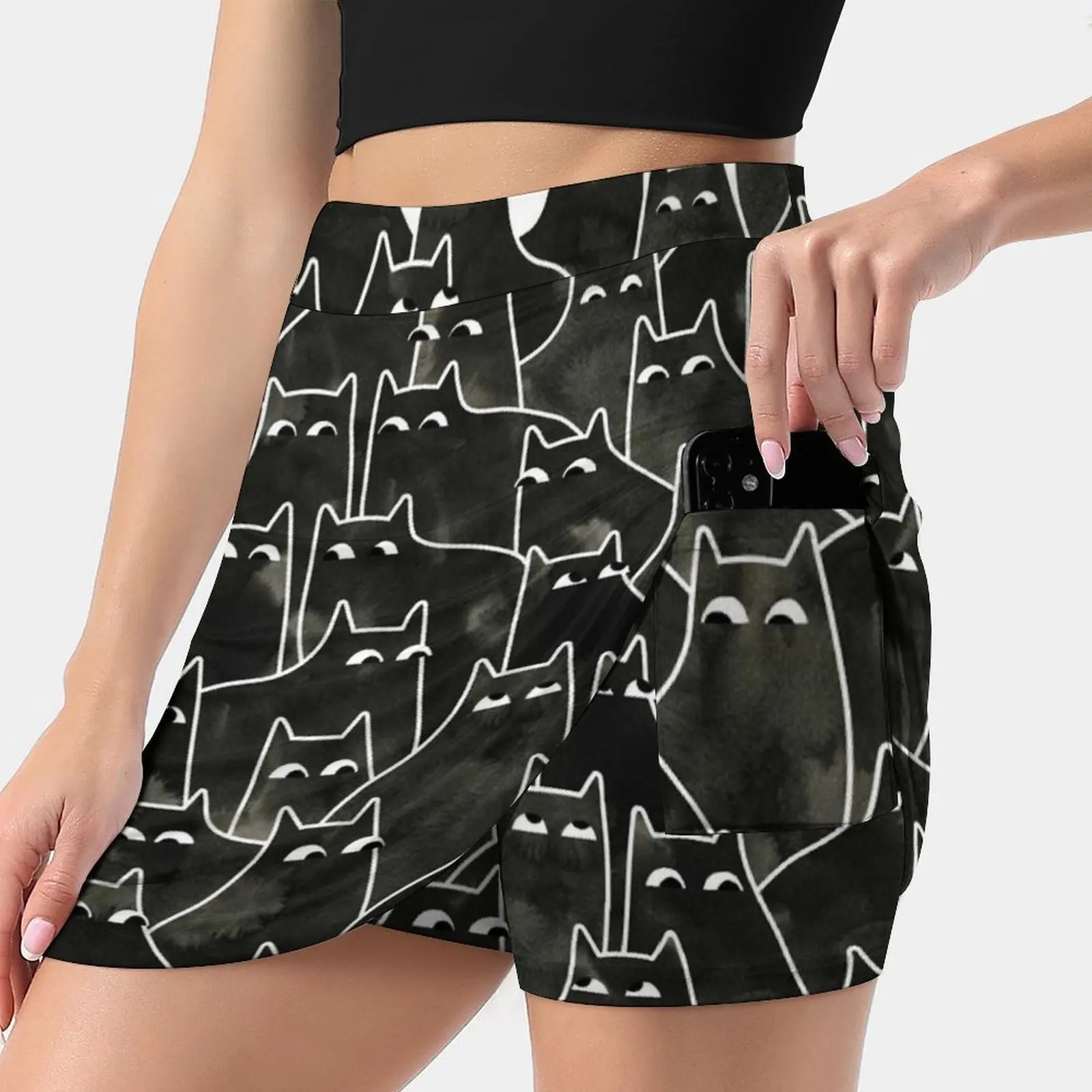Женская юбка с рисунком подозрительных кошек, юбка для тенниса со скрытым карманом, юбки для гольфа, юбки для бадминтона, юбки для бега с рисунком кошек и кошек, Черная