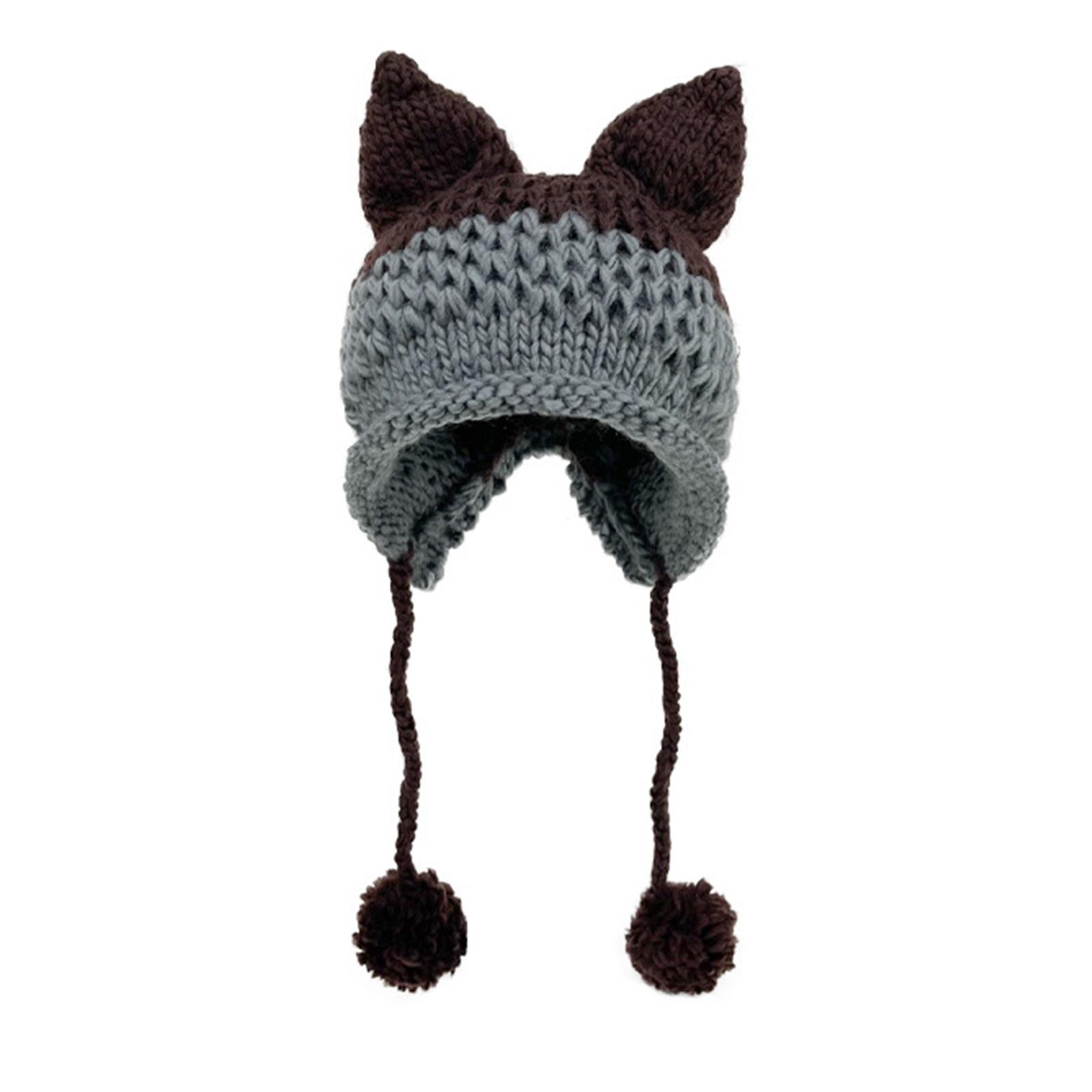 Женская японская милая вязаная шапка-бини с кошачьими ушками и плюшевой подвеской в виде шарика, теплая вязаная шапка-ушанка в стиле гранж с цветными блоками