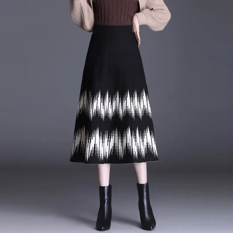 Женские Вязаные Теплые юбки с высокой талией, свободные трапециевидные юбки средней длины в стиле пэчворк, A95, Осень-зима 2021