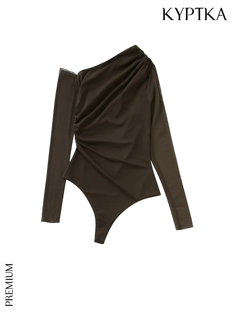 Женские Модные тюлевые Асимметричные плиссированные боди KYPTKA, винтажные женские боди с открытыми плечами и длинным рукавом