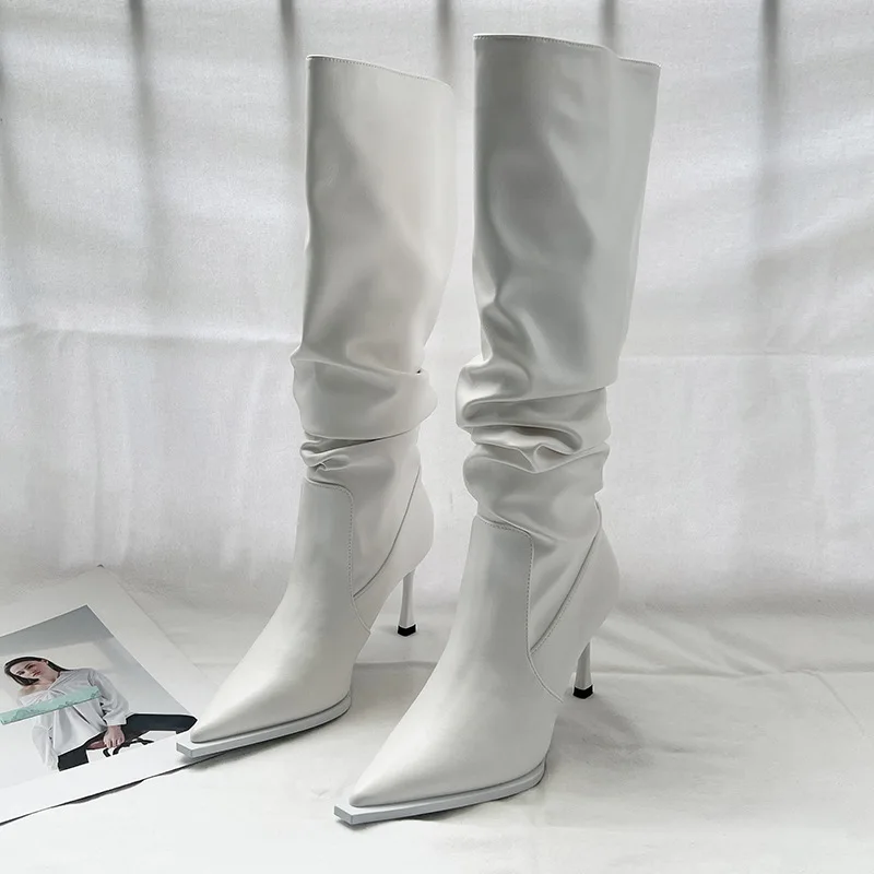 Женские Плиссированные сапоги до колена, на низком каблуке, с молнией и острым носком