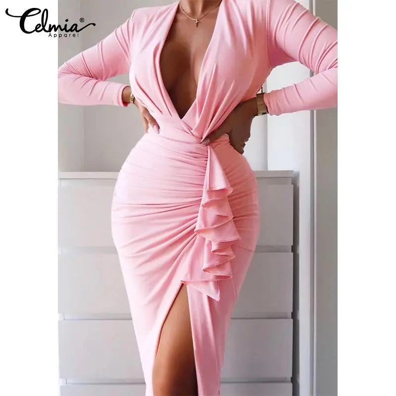 Celmia Women Party Dress 2022 New Elegant Hem Slit Bodycon Midi Vestidos Sexy V-neck Dress Fashion Clubbing Pleated Ruffled Robe