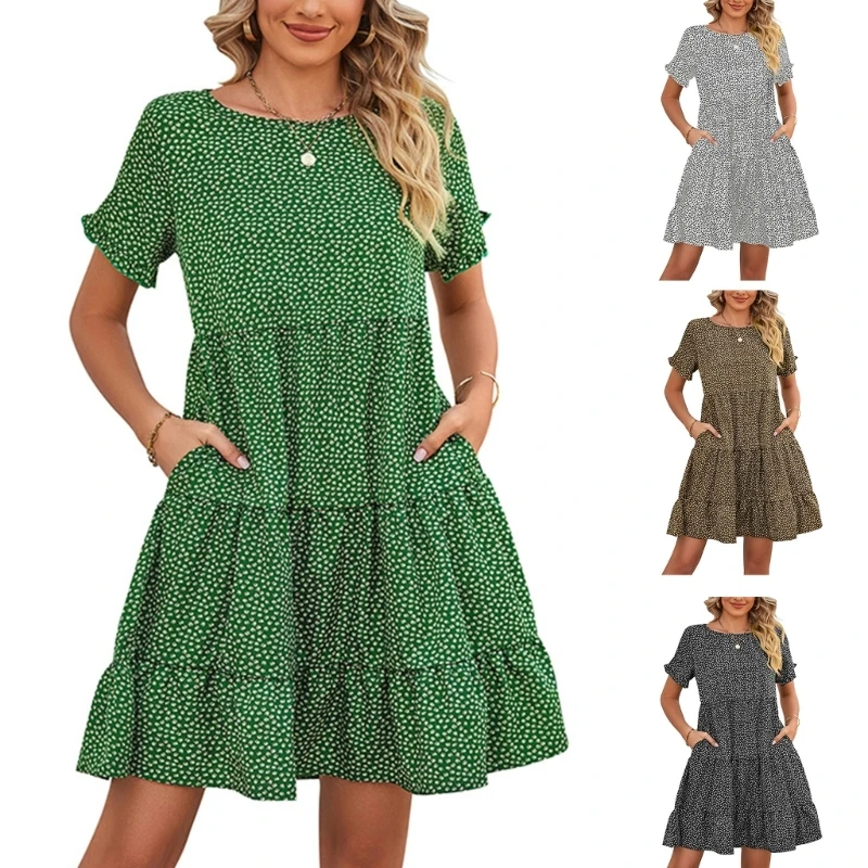Женские богемные платья с круглым вырезом, свободное платье с цветочным принтом и коротким рукавом