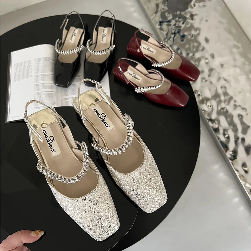 Женские босоножки без задника, элегантные босоножки на высоком каблуке с ремешком на пятке, туфли без задника с квадратным носком и блестка...