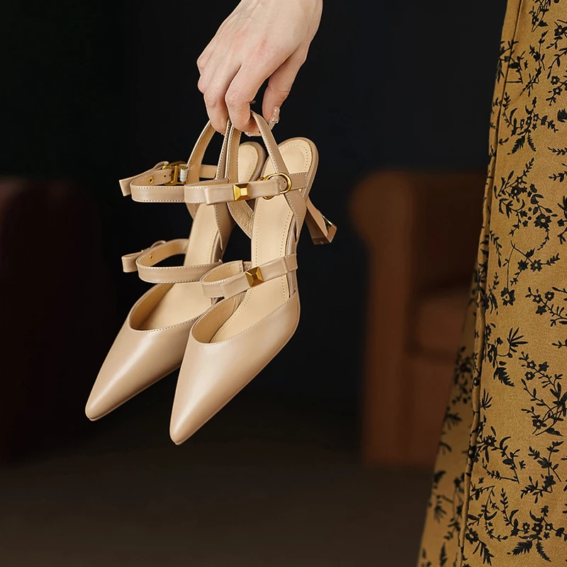 Женские босоножки из натуральной кожи, винтажные босоножки из воловьей и свиной шкуры с острым носком и пряжкой с заклепками, 22-25 см, лето 2023