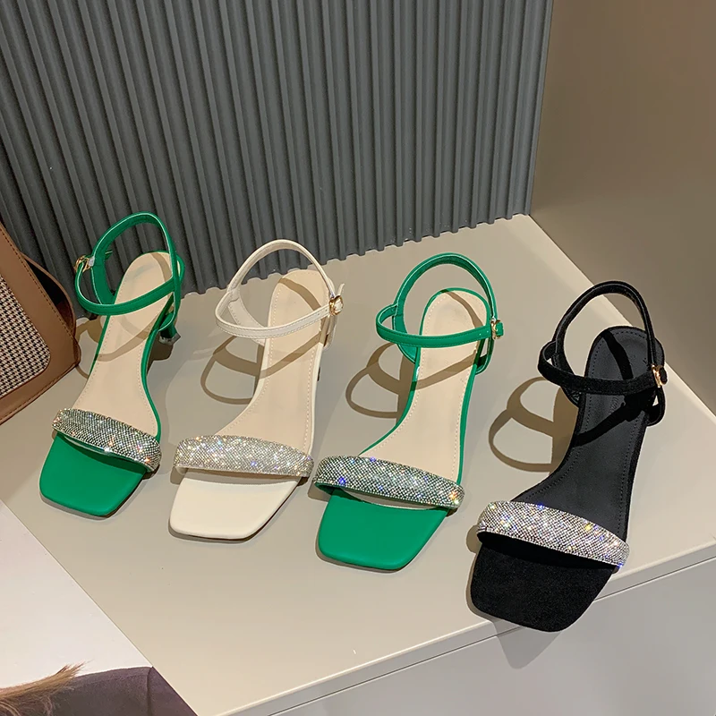 Женские босоножки на высоком каблуке, зеленые сандалии с квадратным носком и ремешком на щиколотке, со стразами, новинка 2022