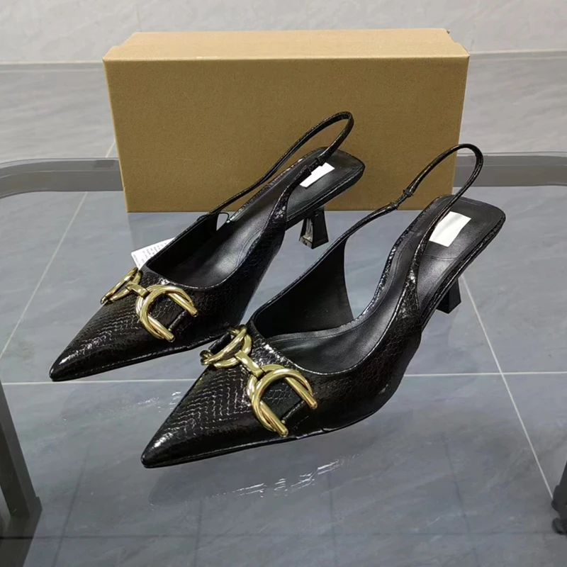 Женские босоножки на высоком каблуке, туфли с острым носком и металлической пряжкой, сандалии с ремешком сзади и открытым носком, лето 2023